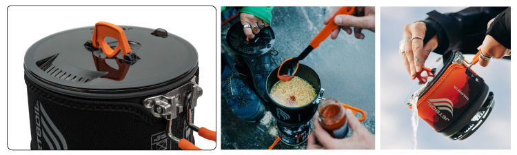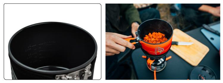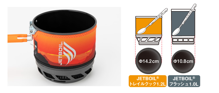 JETBOILフラッシュ1.0Lのクッカーと比較して、口を広く、高さを低く設計し、調理用に最適化。調理や食事の際に、カトラリーを持つ手がクッカーに触れにくく、より快適・安全に使用できます。
