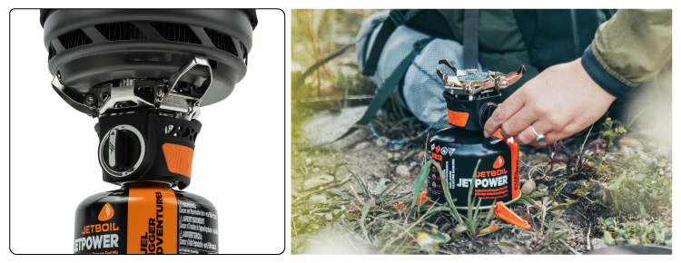 一般的なクッカーの熱効率(30〜40%程度)に比べて、ジェットボイルのクッカーは80%以上の高い熱効率を発揮し、ガスの消費量がおよそ1/2程度。その理由は、クッカーの底に取り付けられている「フラックスリング」。フィン状のリングが、熱損失を最小減に抑えてバーナーの熱を吸収し、小さな火力でも素早く沸騰し、燃費も非常に良好です。